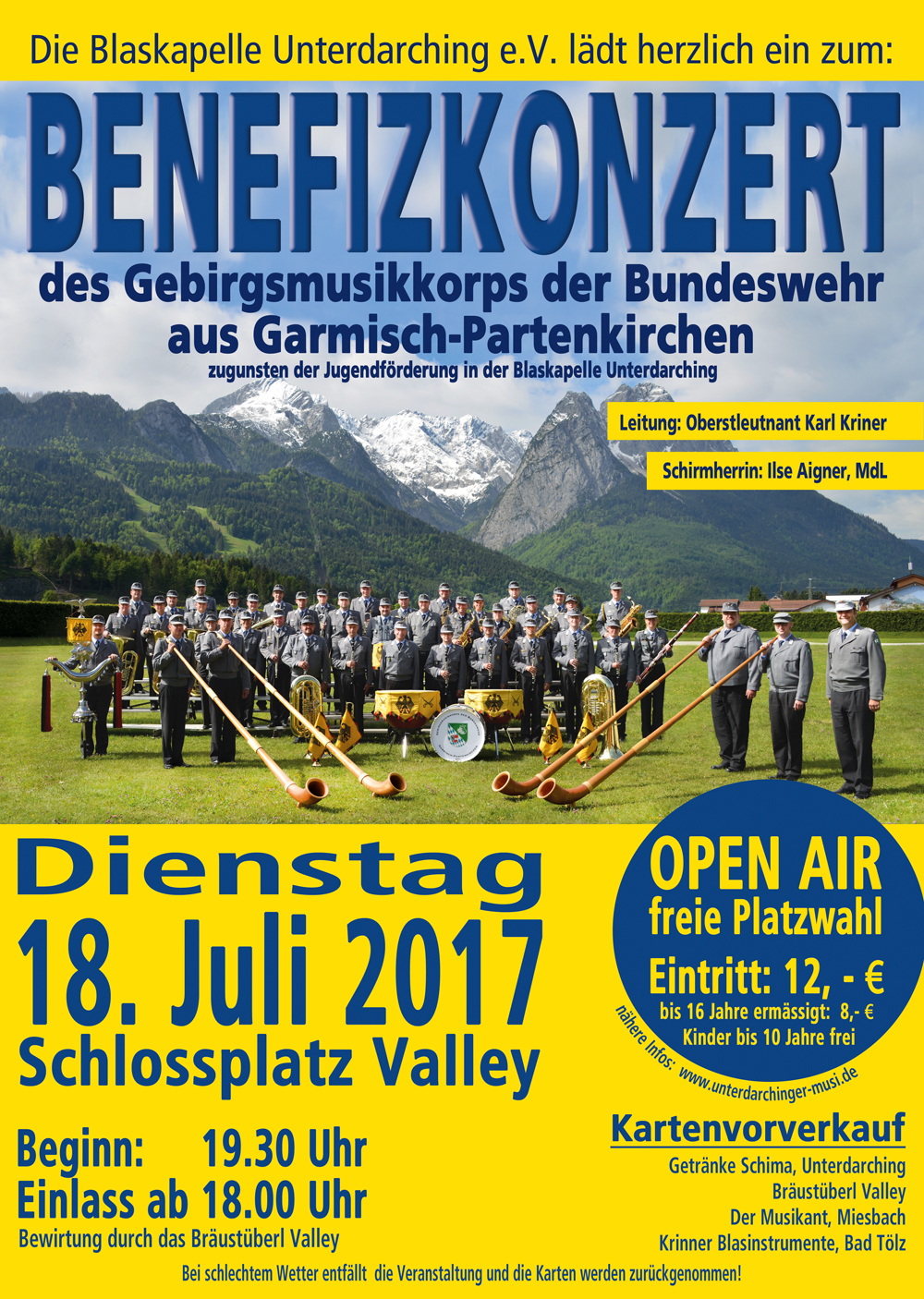 Am 18. Juli 2017 laden wir das Gebirgsmusikkorps aus Garmisch-Partenkirchen nach Valley auf den Schloßplatz zum Benefizkonzert ein.